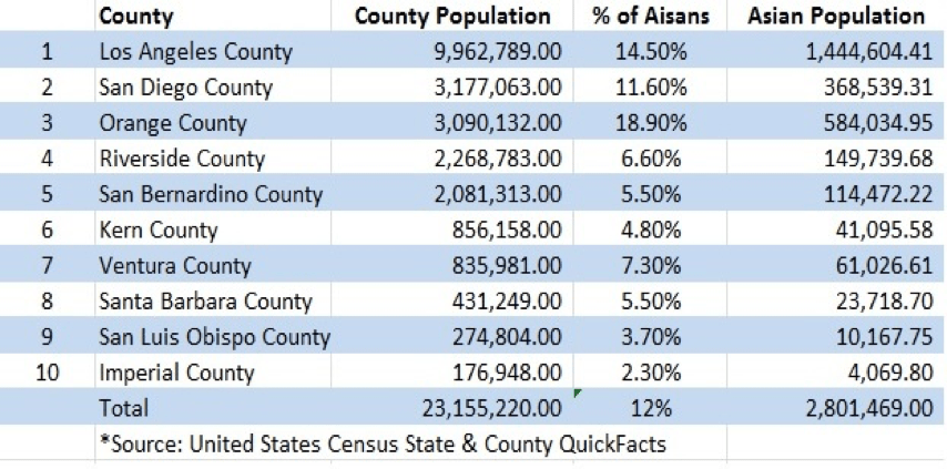 亞裔人口約占南加州人口的12%。據統計,亞洲移民多數在美國西海岸安家。歷史上,早期的廣東移民多集中在三藩市地區發展,而來自臺灣和許多大陸的移民則多在大洛杉磯地區紮根。下表列出了亞裔人口在南加州10個縣中的分佈情況: